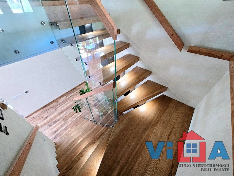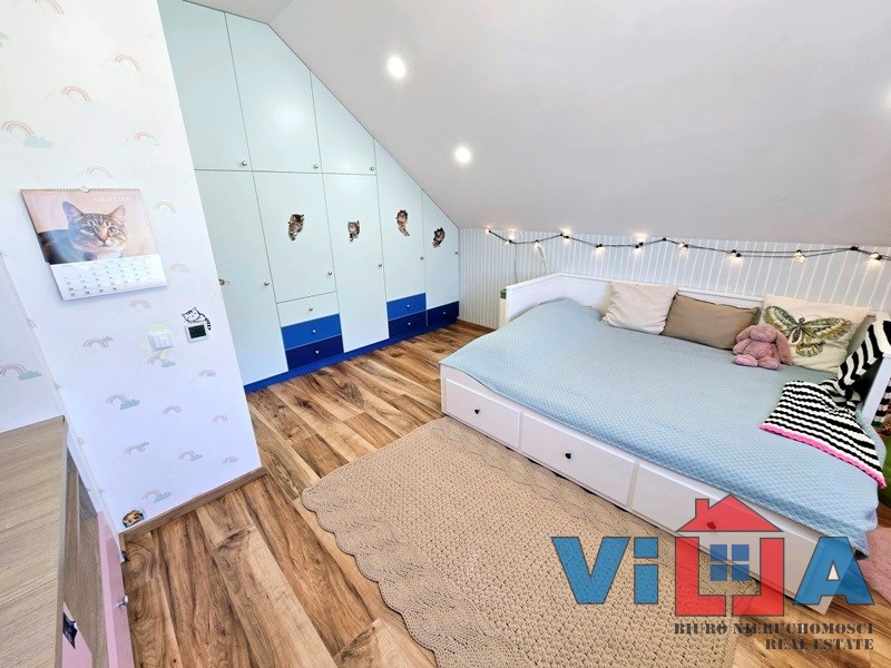 Na poddaszu znajduje się prywatna strefa domowników – cztery spore sypialnie, w tym główna z własną garderobą i łazienką, zapewniają komfort i niezależność każdemu z mieszkańców, salon kąpielowy z wanną z hydromasażem oraz z kabina prysznicową, oraz pomieszczenie socjalne pralnia.