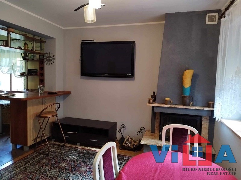 W salonie znajduje się kominek co nadaje pomieszczeniu klimatu oraz ciepła, które ogrzewa zimą całość nieruchomości.