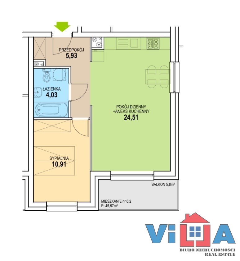 - salonu z aneksem kuchennym (24,51 m2) z wyjściem na balkon (5,8 m2)