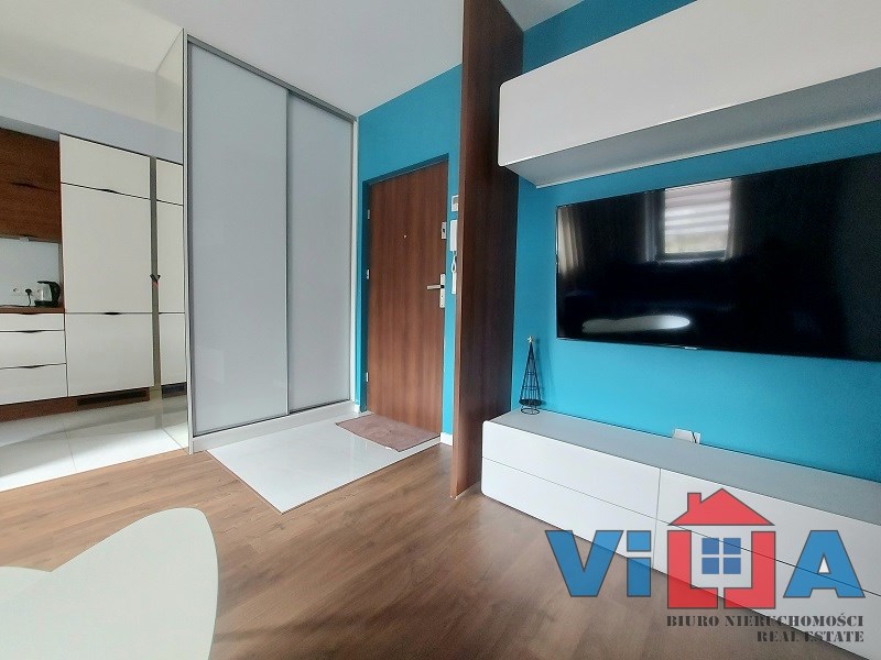 Salon dzienny połączony z aneksem kuchennym, przedpokój z szafą przesuwną z lustrem, łazienka wraz z WC