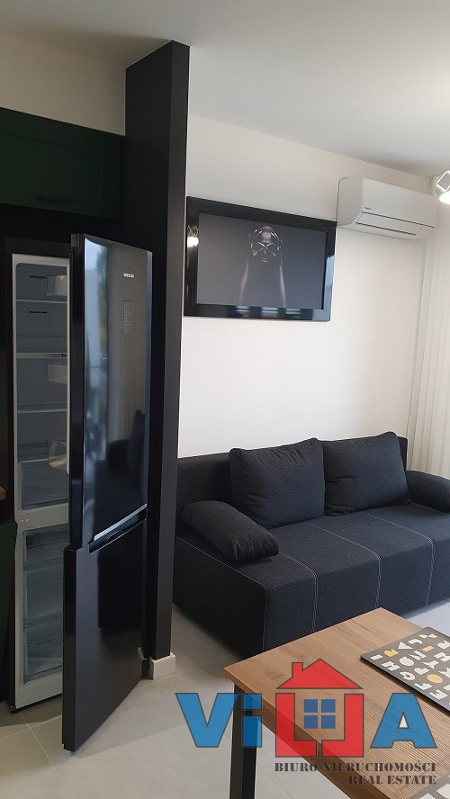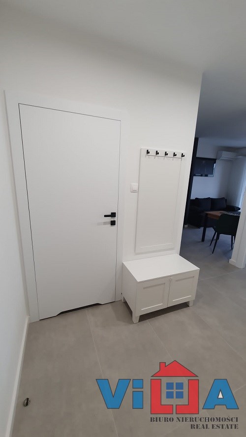 Aneks kuchenny z meblami zrobionymi na wymiar, wyposażony jest w sprzęty AGD – lodówka, zmywarka, piekarnik, płyta indukcyjna. W salonie znajduje się rozkładana kanapa, stoliki kawowe, szafka RTV, stół jadalny wraz z krzesłami. W sypialni łóżko z wygodnym materacem. Łazienka z wygodną kabiną prysznicową, WC kompaktowe, pralka. W przedpokoju duża szafa oraz szafka na buty.